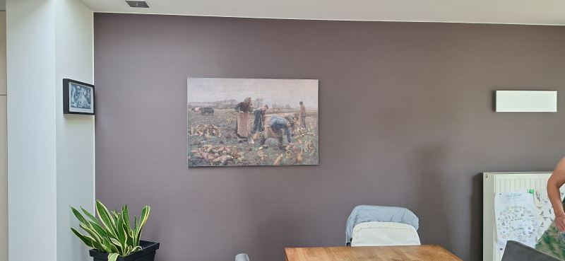 Na een bezoek aan het Mudel museum in Deinze waar talrijke werken van Emile Claus te bezichtigen zijn, had ik het idee opgevat om een reproductie van zijn werk (zie foto van de bietenoogst) voor mijn vrouw te kopen. Helaas waren er leverproblemen maar na 1 mail en wat foto's van de schade aan het kader werd alles meteen en correct opgevolgd en nageleverd, waarvoor dank! Vandaag heb ik alles netjes kunnen ophangen, het is een eenvoudig te monteren kadersysteem en met de herstelbare schroeven kan je het perfect horizontaal hangen.