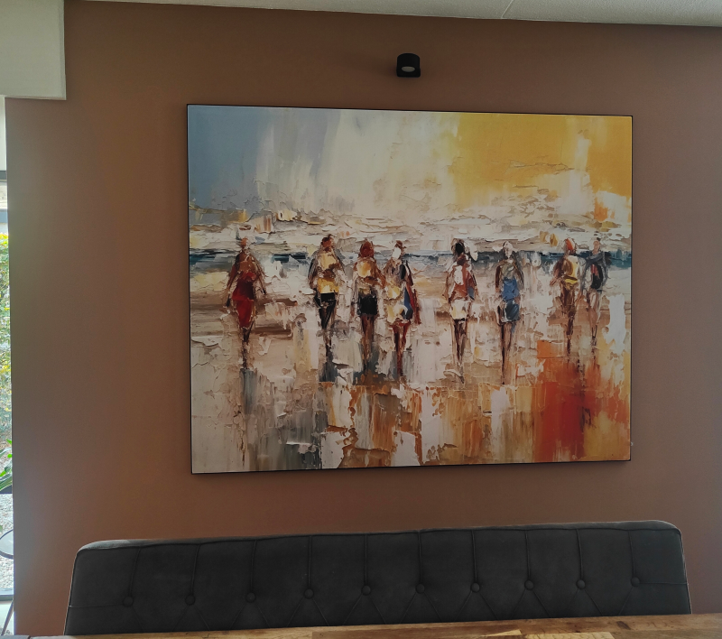 Helemaal blij met ons artframe! Wel wat keuzestress of de kleuren ook daadwerkelijk mooi uit zouden komen thuis. De app is al een heel fijn hulpmiddel, maar het ligt er wel een beetje aan in welke lichtomstandigheden je thuis een foto van je muur neemt hoe het toegevoegde werk staat/kleurt. Ik zou graag de mogelijkheid gehad hebben om bijvoorbeeld een ansichtkaart te bestellen van het werk zodat ik eerst de kleuren in huis zou kunnen checken voordat ik het werk daadwerkelijk bestel. Het is helemaal goedgekomen, en over een wisseldoek wordt ook al nagedacht. Wij zijn blij!