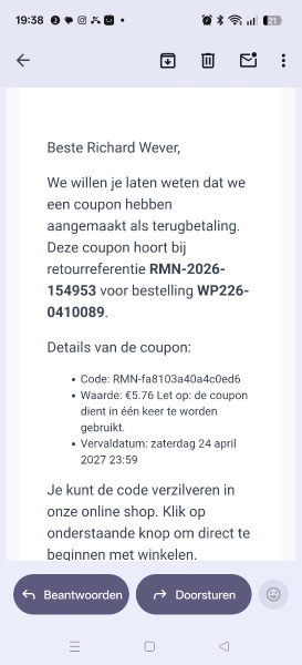 Heb het bedrag van mijn door u gegeven coupon van €5,76 nooit kunnen innen. In