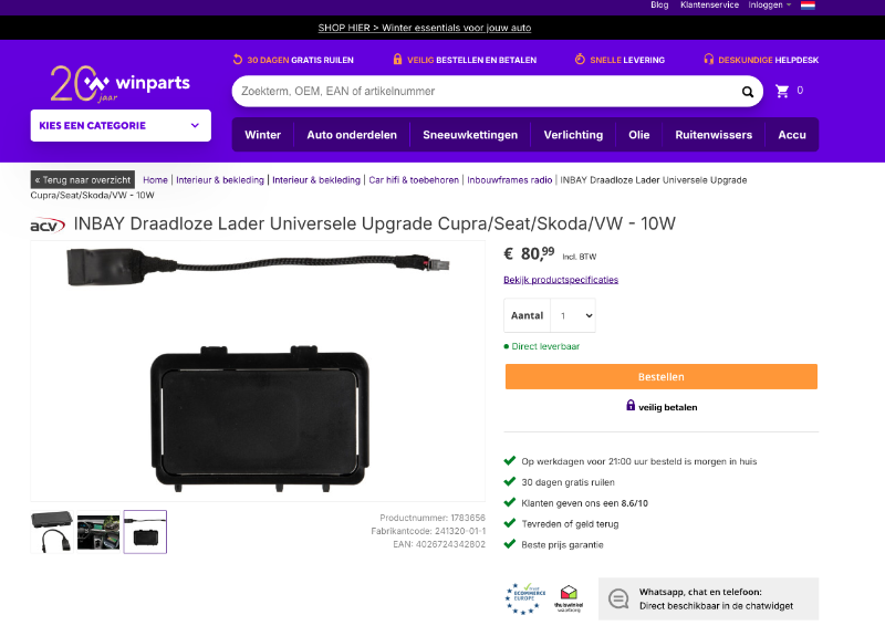 Op de website geven ze aan "vandaag bestellen, morgen geleverd". tweemaal iets besteld en tweemaal is het pakket een week en langer onderweg. Via mail en telefonisch contact kunnen ze niet zeggen wanneer de levering zal plaatsvinden. telkens schuift het een dag verder op. Als professionele klant ben je niets met zo'n partij. Ik kan het alleen maar afraden en wij bestellen nooit meer bij Winparts.
