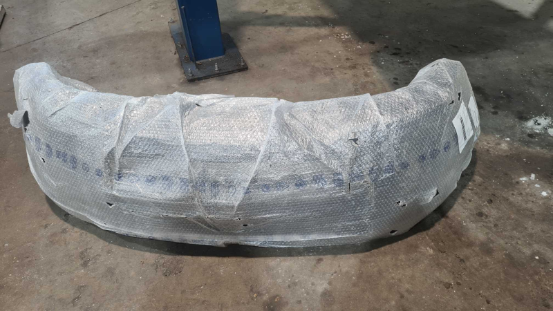 Bumper word geleverd in bubbelplastic wat vast zit met 4 stukken tape. de bumper is op verschillende plekken beschadigd.
