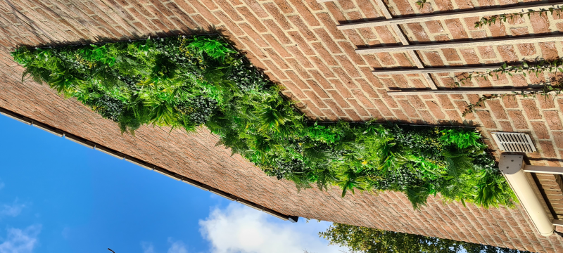 Een prachtig eindresultaat na een lange voorbereiding. We hebben er veel voorbereidingswerk aan gehad omdat we voor de zekerheid elk takje met het lijmpistool hebben vastgezet. De haag is zo mooi dat mensen komen aanbellen om te weten waar we deze haag gekocht hebben.