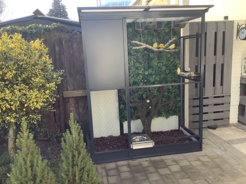 Ik ben dik tevreden . De kanaries in de volière zijn vogels mij ook tevreden zie foto