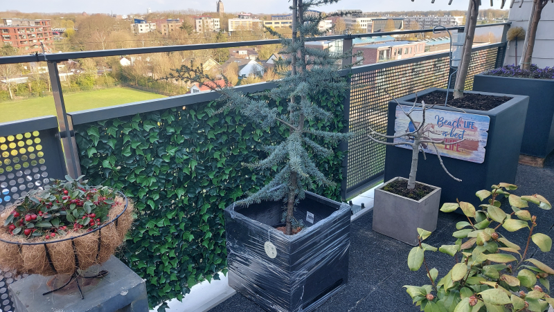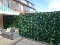 Na wat zoeken op internet kwam ik uit op de website van kunsthaagvoordeel.nl. Gekozen voor Hedera met bloem Kunsthaag - 50x50cm. Prachtige dekking, ziet er niet "te plastic" uit. Netjes verpakt en op tijd geleverd en heel gemakkelijk aan te brengen. Het enige aandachtspuntje: op het moment dat ik op de website keek waren wel heel veel producten niet op voorraad. Maar misschien is iedereen nog steeds erg bezig met verfraaien van de woning e.d.