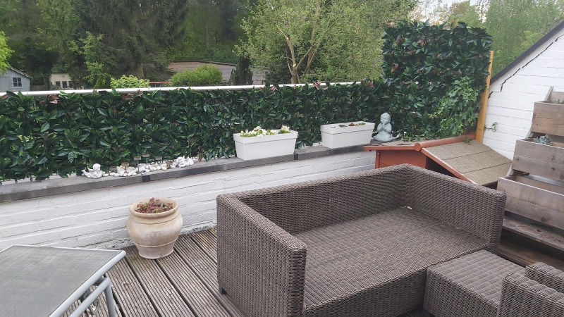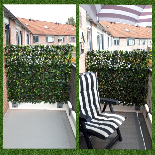 Besteld en een dag later in huis. Zeer vriendelijk telefoongesprek gehad ivm bestelling. Product (harmonica kunst laurierhaag) is kwalitatief uitstekend en erg makkelijk te instaleren, binnen 15 minuten. Inmiddels veel complimenten gehad over de haag. Met een ingericht balkon (op de foto is het nog wat leeg) is het echt een mooie afscheiding. De haag heeft de eerste dagen een chemisch luchtje. Ik vermoed van een impregneer behandeling. Maar dat is na een paar dagen weg. Ben er echt heel erg blij mee.