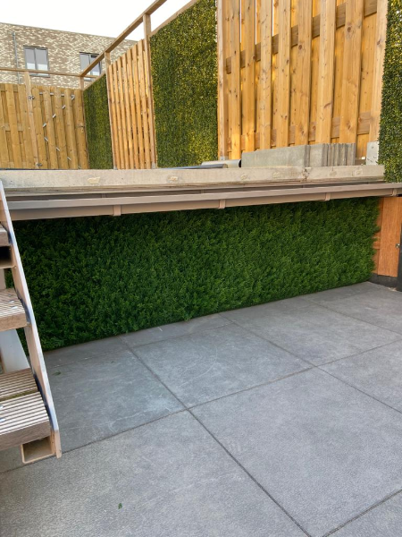 Vanwege veel inkijk achterburen bedacht een hoge omheining te maken. Omdat het lang duurt voordat dat dicht zit met echte haag, voor een kunststof variant gekozen. Door de goede beoordelingen van andere klanten gekozen voor Kunsthaagvoordeel. Het eindresultaat is geweldig geworden, 9 meter kunsthaag en binnen een paar uur een groen uitzicht.