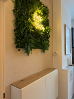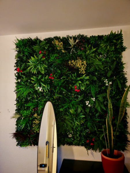 Diese schöne Pflanzenwand ist einfach ein super schöner Hingucker, der eine sehr angenehme Atmosphäre schafft. Die Pflanzen sehen sehr realistisch aus. Außerdem ist es toll, dass man die einzelnen Teile auch noch umstecken kann, um es anzupassen. Einzige Kritik: Leider sind die violetten Blumen sehr klein und nicht wirklich erkennbar. Ich würde mir hier wünschen, dass man einzelne Blumen dazu kaufen kann, um seine Wand nach eigenem Geschmack aufzupimpen. Vorher hatte ich die Befürchtung, dass es stark nach Kunststoff riecht. Das ist jedoch nicht der Fall. Insgesamt kann ich diese Lösung der Wanddekoration nur empfehlen.