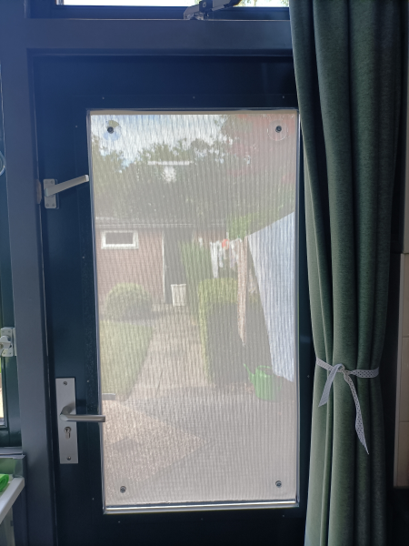 Eenvoudig te monteren, blijft goed zitten en kan nog steeds naar buiten kijken door het doek. Alleen in de avond is het wel snel donker binnen.