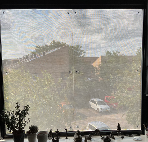 Het was een probeersel omdat we geen vast screen kwijt kunnen bij de ramen. Met bijna de hele dag de zon erop. Maar werkt prima.