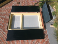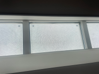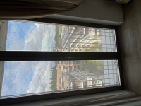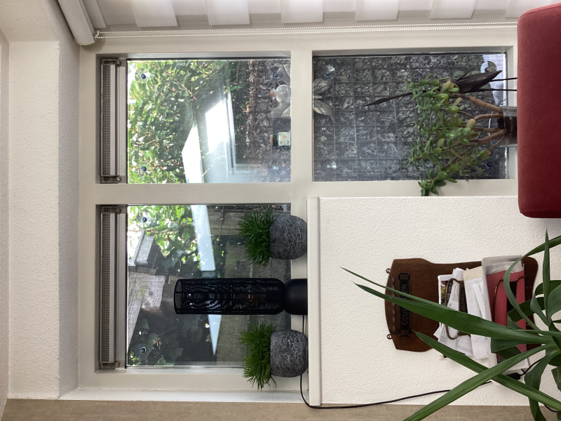 Direct na ontvangst aan de slag gegaan. Er was een trap nodig om helmaal bovenaan het glas te kunnen komen. Ik ben alleen, 83 jaar, maar wilde het zo snel mogelijk plaatsen. En het lukte. Hier en daar nog wel iets verbeteren, maar ik wacht nu totdat mijn hulp er is en zij mij kan steunen op de ladder. Dit grote raam is op het zuiden. De warmte wordt tegengehouden, maar ik kan nog steeds naar buiten kijken. Ik ben hier erg blij mee.