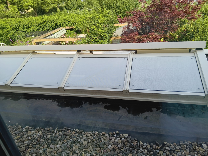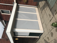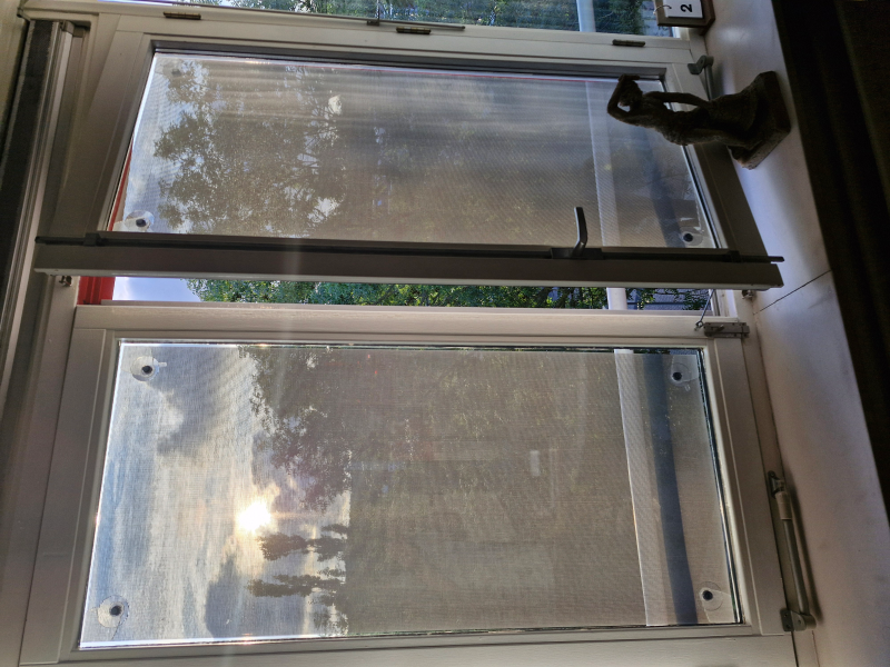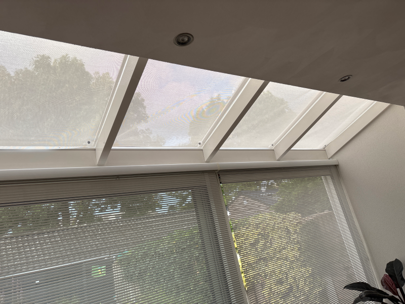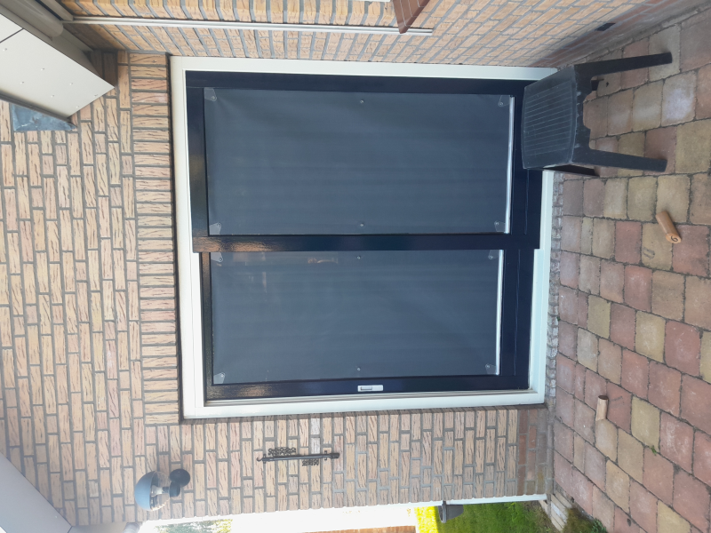 Enigszins sceptisch begonnen met aanbrengen,maar het uiteindelijke effekt op de warmte in de "terrascorridor" viel niet tegen. Het is mij echter niet gelukt om het doek strak tussen de kozijnen te krijgen...................maar ja,een kniesoor die daar op let.....
